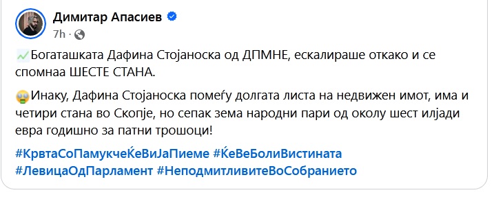 Инаку, Дафина Стојаноска помеѓу долгата листа на недвижен имот, има и четири стана во Скопје, но сепак зема народни пари од околу шест илјади евра годишно за патни трошоци!
